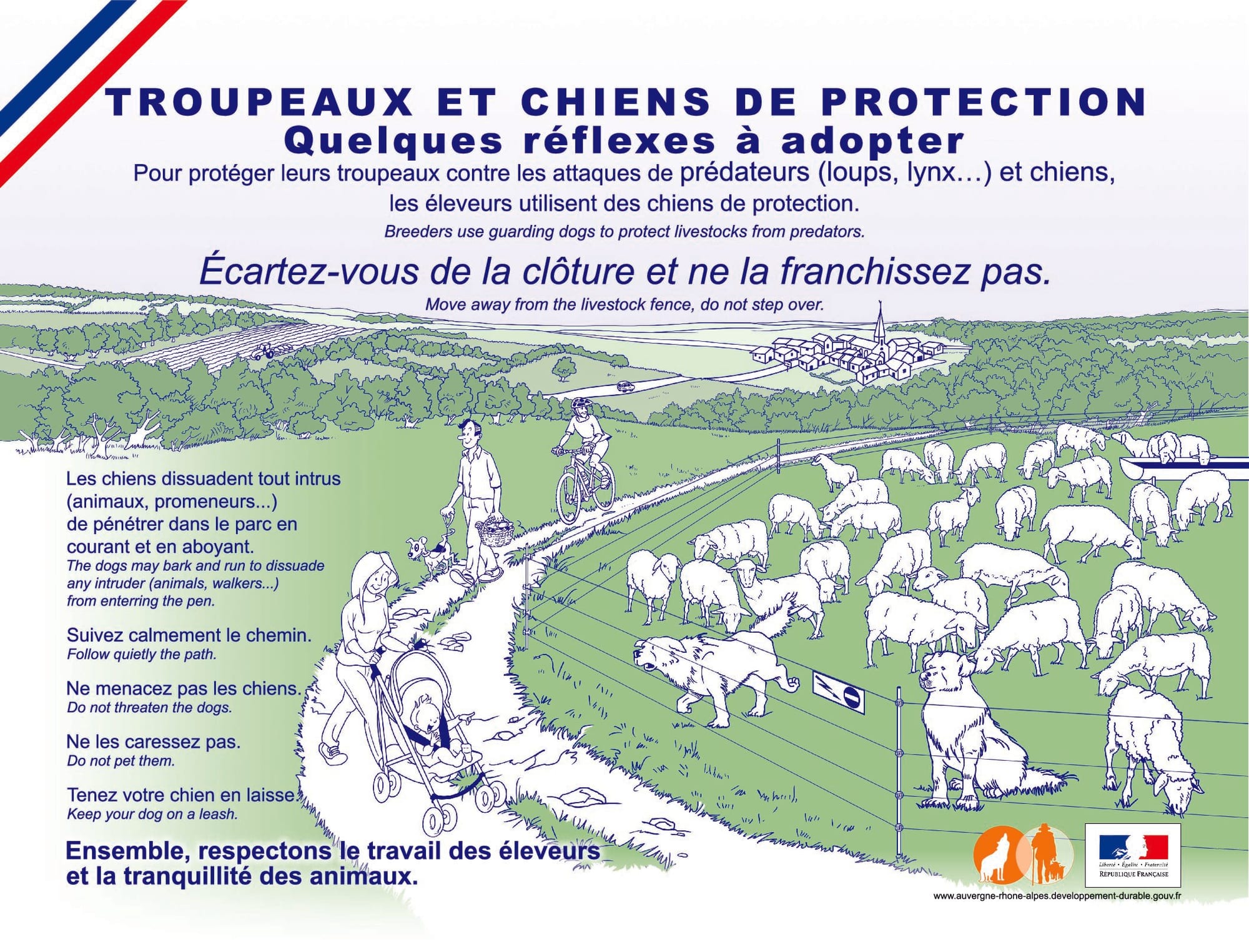 Pour vous aider, il faut avoir en tête que vous pouvez rencontrer des chiens de protection (avec les troupeaux de brebis et de chèvres), hors alpage, aux intersaisons (printemps et automne).