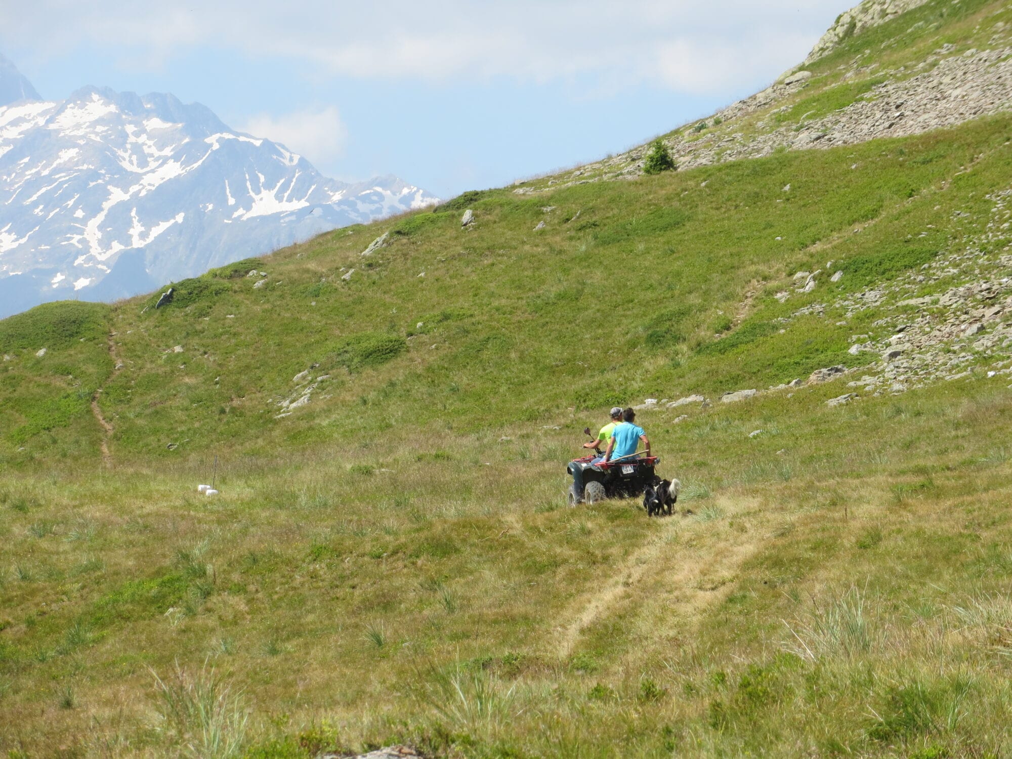 Vous êtes surpris de suivre des pistes « carrossables » ou de croiser un véhicule alors que vous pensiez que c’était interdit ?… Eh oui, les pâturages d’altitude sont aussi des lieux de travail pour les gardiens de troupeaux autorisés à emprunter ces pistes en véhicule. Dans le cadre de leur métier, ils doivent accéder à certains lieux rapidement, et donc en engin motorisé. Les raisons ? Soigner une bête blessée, acheminer du matériel, ramener de la nourriture au berger et/ou aux chiens, se rendre chez le médecin…