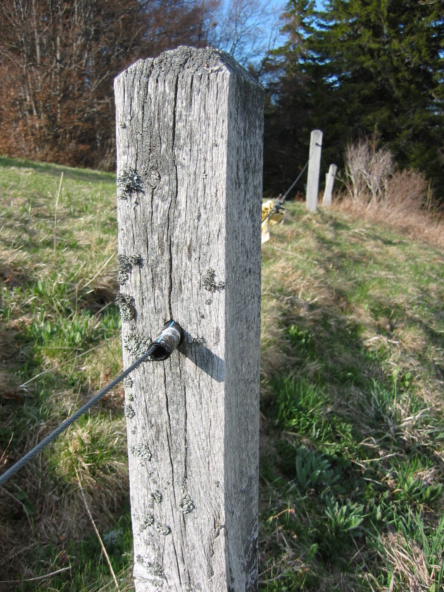 - Les clôtures dites « fixes » avec des piquets en bois ou en métal qui soutiennent un ou plusieurs fils. Elles restent installées tout au long de la saison, car elles contournent de grands pâturages.